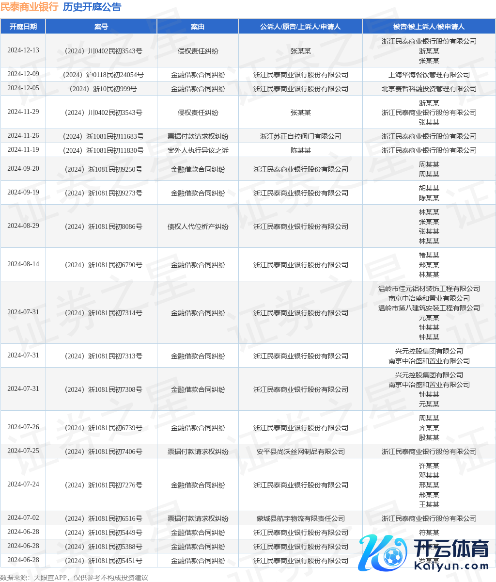 案号:(2024)浙1081民初11683号审理法院:温岭市东说念主民法院案由:单据付款恳求权纠纷当事东说念主信息: 原告/上诉东说念主:浙江苏正自控阀门有限公司 被告/被上诉东说念主:浙江民泰买卖银行股份有限公司开庭日历:2024年11月26日凭据统计,近一年内以浙江民泰买卖银行股份有限公司为当事东说念主的历史开庭公告有78则,其中案由为“金融借款左券纠纷”的公告以67则居首,其次为“单据付款恳求权纠纷”有3则,“侵权职守纠纷”有2则。历史开庭公告(前20条)如下: