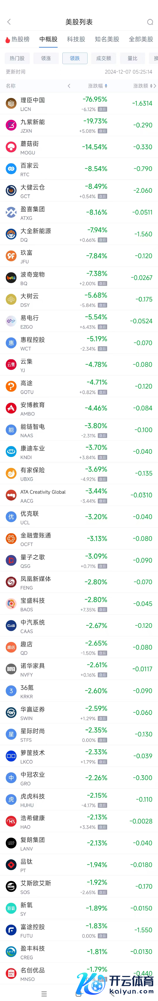 领跌中概股列表: