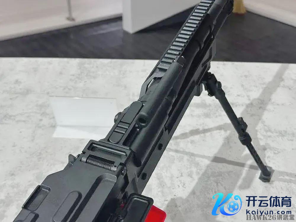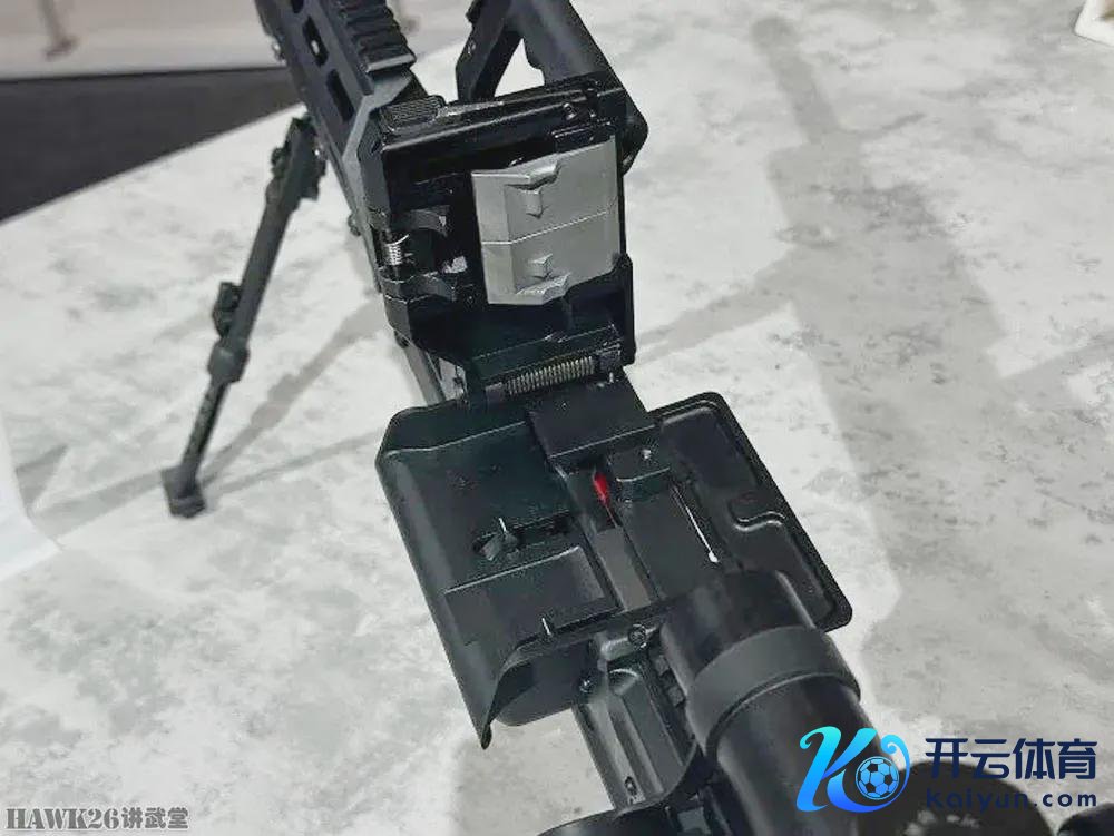 从初步不雅察来看,这挺机枪左侧隆起的托弹盘装有拨弹齿组件,拨弹齿组件在枪机组的轨说念上移动,就像在PKM上看到的雷同。每次枪机组来回通顺时,拨弹齿都会从左向右移动,从而拉动掸链。托弹盘组件与位于受弹机盖右上方的带键锁定销相吻合,该锁定销固定在兵器的前耳轴上。锁定机构可能位于托弹盘下方,掀开受弹机盖时无法看到。