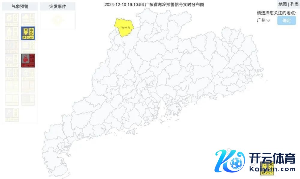 杀青12月10日19时10分广东阴寒预警信号发布情况。广东气候网截图