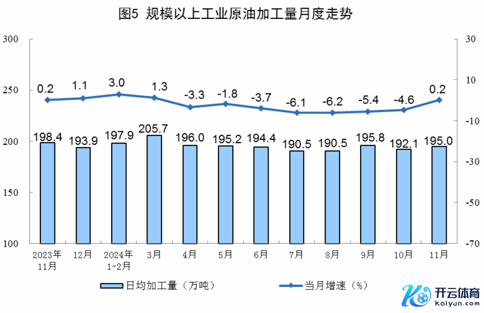 原油加工由降转增。11月份,规上工业原油加工量5851万吨,同比增长0.2%,10月份为下落4.6%;日均加工195.0万吨。1—11月份,规上工业原油加工量64910万吨,同比下落1.8%。