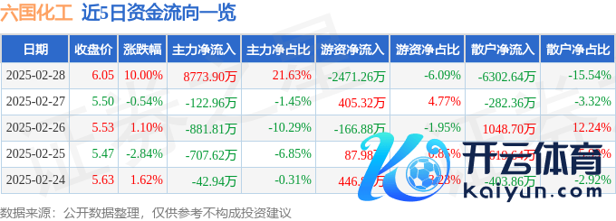 本站音书,纵容2025年2月28日收盘,六国化工(600470)报收于6.05元,高涨10.0%,涨停,换手率13.44%,成交量70.11万手,成交额4.06亿元。