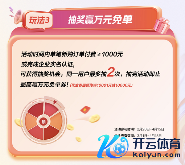 活动时安分单笔订单≥1000元或完成企业实名认证,即可取得抽奖契机,赢取万元免单券,让时期进入即刻回荡为惊喜答复。