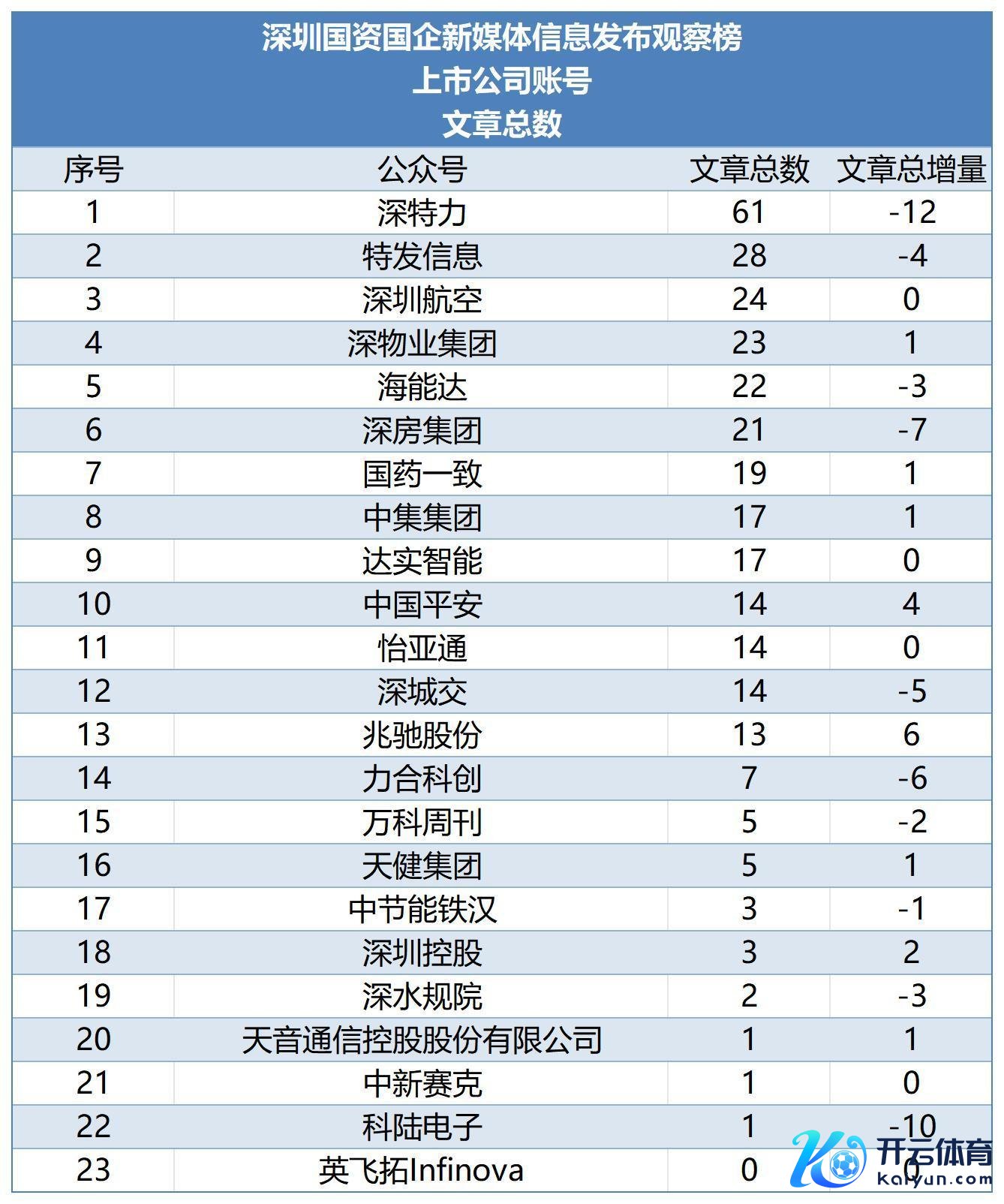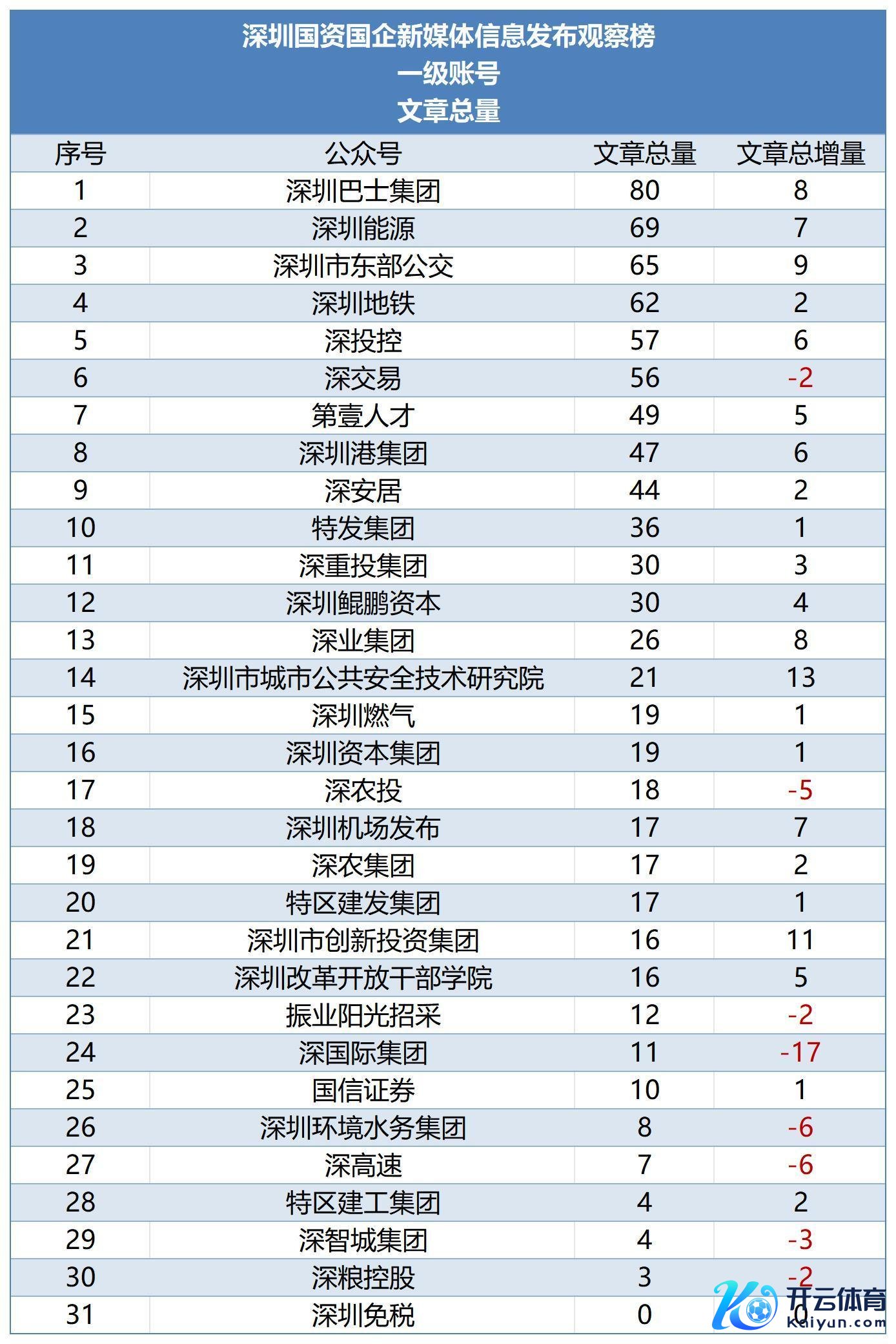 具体到各维度榜单,从著作总和来看,名次前三的分辨为深圳巴士集团(80)、深圳动力(69)、深圳东部公交(65);名次靠后的为特区建工集团(4)、深智城集团(4)、深粮控谷(3)、深圳免税(0),其中深海外集团比拟上个月著作增量下浮彰着,发稿量减少17篇。