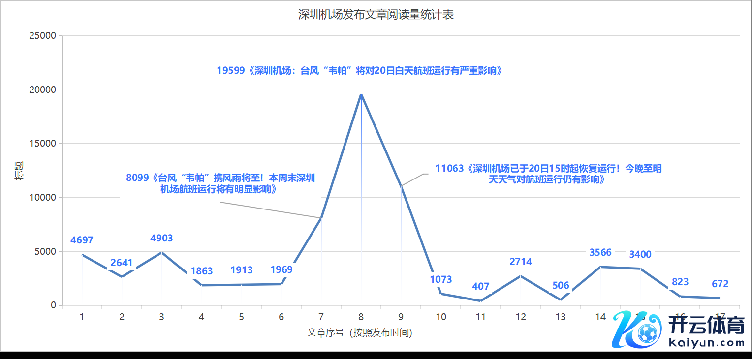 与深安堵相似,深圳机场发布相通聚焦民生刚需作念运营,围绕航空出行全历程,从航班动态、天气影响到出行服务,将“用户最孤寒”更正为内容中枢。从阅读量弧线图来看,像台风“韦帕”联系著作,阅读量冲到19599、11063高值,因为极点天气下,搭客急需航班动态,触发“济急式”高关注;暑运、客流内容翻新高,也因粉饰暑期大客流、家庭出行刚需,带来阅读小岑岭。